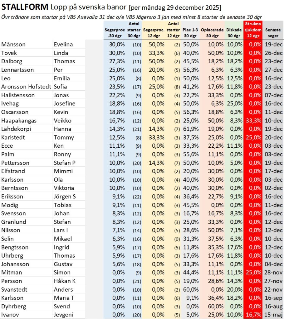 Vinstfaktors kommentar om stallform: Stallform är ett intressant fenomen inom travet, men likväl bevisat avgörande, gång på gång. Vi använder oss mycket av stallform när vi läser på loppen och funderar kring nyckelhästar i olika omgångar. Vi kommer givetvis att ta den här statistiken i stor beaktning när vi gör vårt material, men det är också kul att kunna bjuda Vinstfaktors prenumeranter på siffrorna, säger 67-mijlonersvinnaren Micke Oscarsson, en av experterna på sajten.