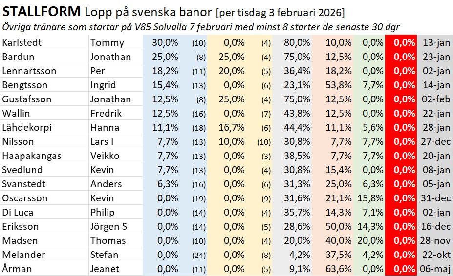 Vinstfaktors kommentar om stallform: Stallform är ett intressant fenomen inom travet, men likväl bevisat avgörande, gång på gång. Vi använder oss mycket av stallform när vi läser på loppen och funderar kring nyckelhästar i olika omgångar. Vi kommer givetvis att ta den här statistiken i stor beaktning när vi gör vårt material, men det är också kul att kunna bjuda Vinstfaktors prenumeranter på siffrorna, säger 67-mijlonersvinnaren Micke Oscarsson, en av experterna på sajten.